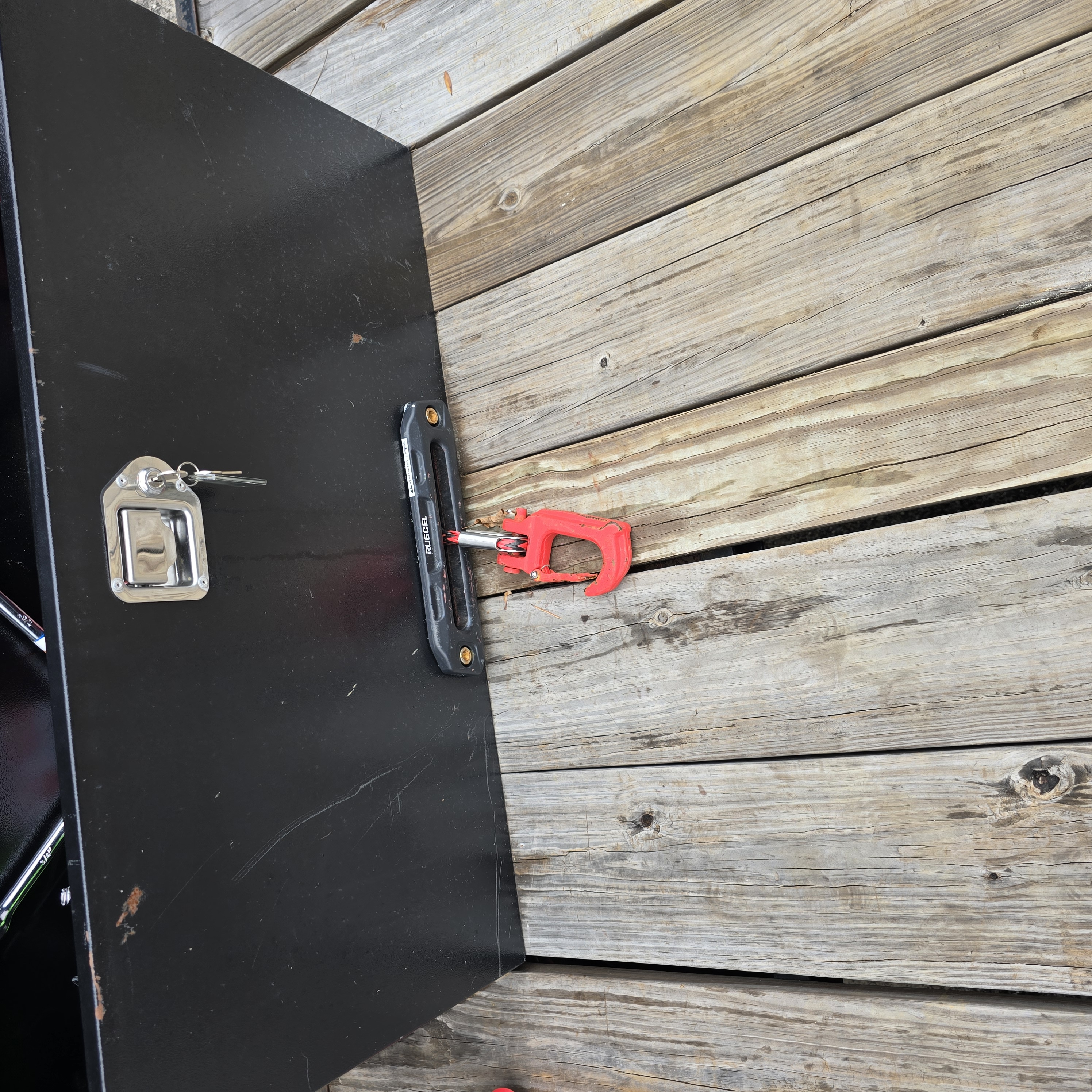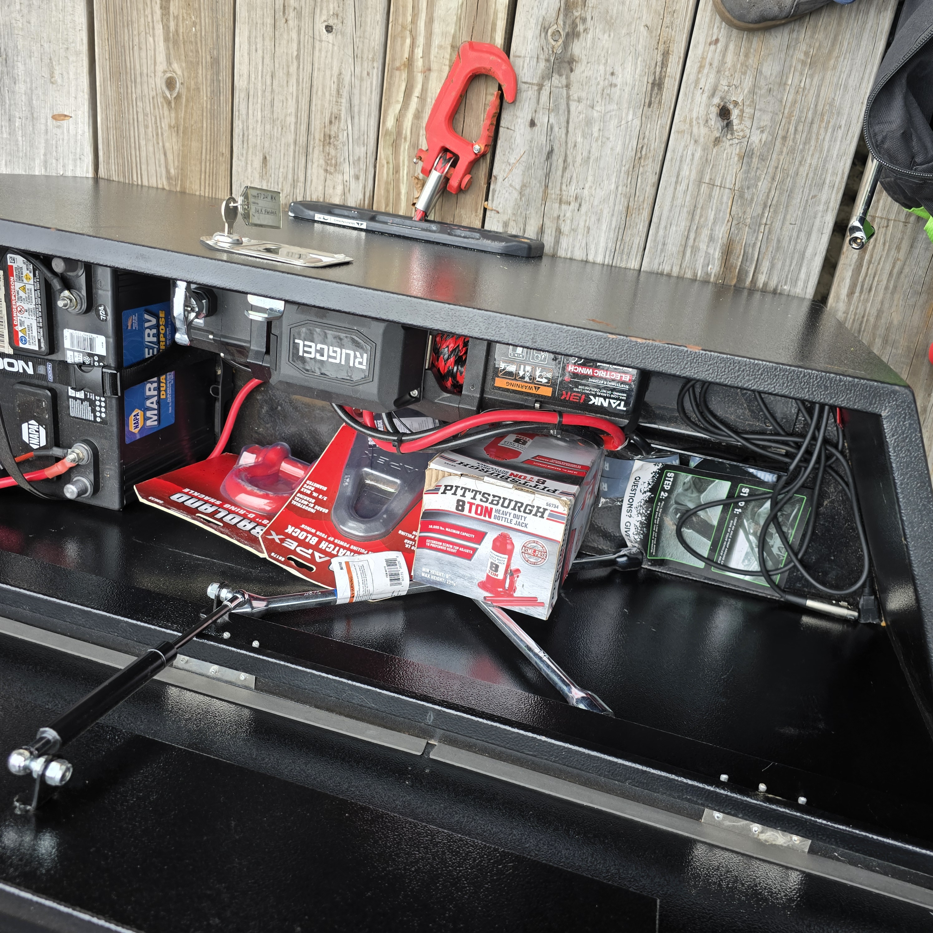 Steel deck comes with 13k winch and full set of car straps and axle straps. Has removable driver side fender. Weight cap is 5,000 pounds. Spare tire and tire change kit included.
